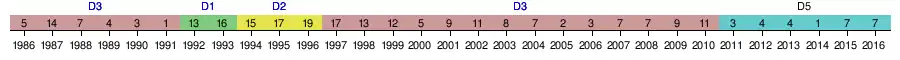 | 2006 | 3e | 63 | 36 | 19 | 6 | 11 | 52 | 38 | +14 | Seizièmes de finale | |