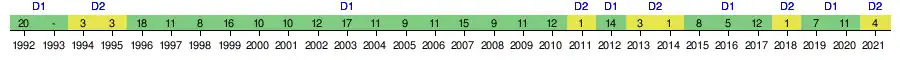 1994 2e 3e 49 36 22 5 9 65 27 +38 Seizièmes de finale