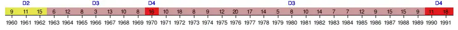 | 1969 | 8e | 35 | 34 | 14 | 7 | 13 | 38 | 35 | +3 | — | |