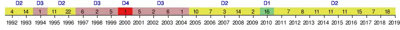 | 1990 | 4e Zone 10 | 11e | 22 | 28 | 8 | 6 | 14 | 25 | 37 | -12 | |