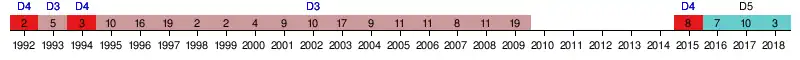 | 2004 | 9e | 49 | 32 | 14 | 7 | 1 | 33 | 28 | +5 | Deuxième tour | |