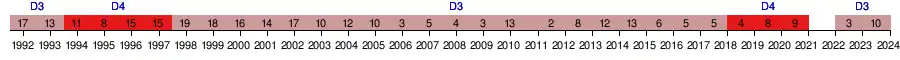 | 1990 | 4e Zone 6 | 10e | 29 | 32 | 11 | 7 | 14 | 35 | 36 | -1 | |