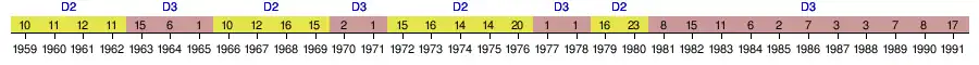| 1959 | 2e Zone 3 | 10e | 22 | 26 | 8 | 6 | 12 | 30 | 40 | -10 | — |