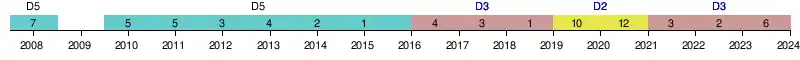 | 2014 | 2e | 77 | 30 | 25 | 2 | 3 | 101 | 22 | +79 | ||