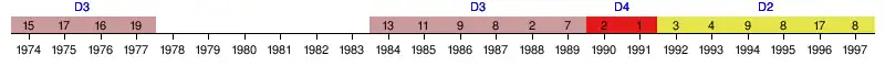 | 1994 | 2e | 9e | 44 | 42 | 17 | 10 | 15 | 59 | 56 | +3 | — |