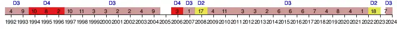 | 1993 | 3e Zone 3 | 9e | 33 | 34 | 11 | 11 | 12 | 27 | 30 | -3 | |