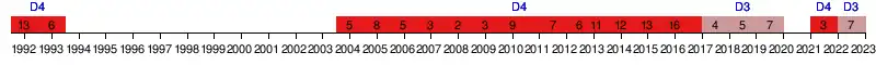 | 1992 | 4e Zone 7 | 13e | 15 | 28 | 4 | 7 | 17 | 22 | 50 | -28 | — |