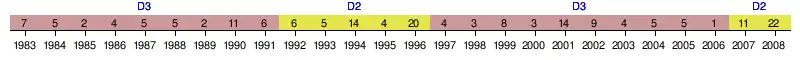 | 1982 | 3e | 35 | 28 | 14 | 7 | 7 | 40 | 31 | +9 | ||