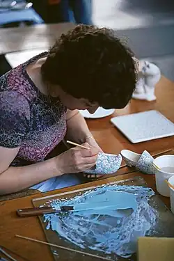 La pièce complètement émaillée est cuite une première fois à 750 °C pendant une nuit. Une opération de retouche, nommée « la repasse », a alors lieu pour combler les trous occasionnés par l'éclatement des bulles d'air. La pièce est cuite une seconde fois à 750 °C[14]. Puis, pour certaines pièces, l'or est posé au pinceau, avant une troisième cuisson à 600 °C. Après ces différentes étapes, on passe de la terre de Sienne ou un colorant sur la surface émaillée pour rendre visibles les craquelures ; la pièce est alors terminée.