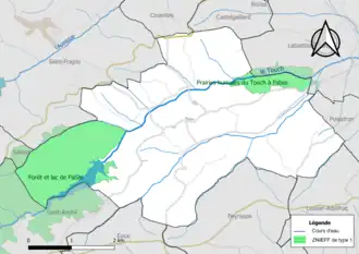 L’inventaire des zones naturelles d'intérêt écologique, faunistique et floristique (ZNIEFF) a pour objectif de réaliser une couverture des zones les plus intéressantes sur le plan écologique, essentiellement dans la perspective d’améliorer la connaissance du patrimoine naturel national et de fournir aux différents décideurs un outil d’aide à la prise en compte de l’environnement dans l’aménagement du territoire. Deux ZNIEFF de type 1[Note 2] sont recensées sur la commune[18] : la « forêt et lac de Fabas » (831 ha), couvrant 5 communes du département[19] et les « prairies humides du Touch à Fabas » (86 ha), couvrant 2 communes du département[20].