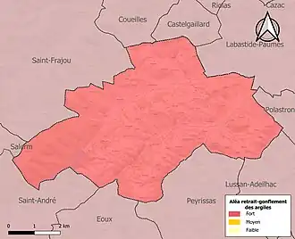 Le retrait-gonflement des sols argileux est susceptible d'engendrer des dommages importants aux bâtiments en cas d’alternance de périodes de sécheresse et de pluie. La totalité de la commune est en aléa moyen ou fort (88,8 % au niveau départemental et 48,5 % au niveau national). Sur les 128 bâtiments dénombrés sur la commune en 2019, 128 sont en aléa moyen ou fort, soit 100 %, à comparer aux 98 % au niveau départemental et 54 % au niveau national. Une cartographie de l'exposition du territoire national au retrait gonflement des sols argileux est disponible sur le site du BRGM[27],[Carte 3].