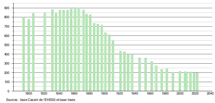 | L'évolution du nombre d'habitants est connue à travers les recensements de la population effectués dans la commune depuis 1793. Pour les communes de moins de 10 000 habitants, une enquête de recensement portant sur toute la population est réalisée tous les cinq ans, les populations de référence des années intermédiaires étant quant à elles estimées par interpolation ou extrapolation[31]. Pour la commune, le premier recensement exhaustif entrant dans le cadre du nouveau dispositif a été réalisé en 2008[32]. En 2022, la commune comptait 199 habitants[Note 4], en évolution de −1,97 % par rapport à 2016 (Haute-Garonne : +8,02 %, France hors Mayotte : +2,11 %). |