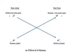 Souvent, les deux personnages se trouvent dans des positions subjectives fort dissemblables. L'un se vante de sa force, de ses habiletés ou de son importance : il est en position haute ; l'autre apparaît comme faible ou dépourvu de ressources : il occupe la position basse. Grâce à un évènement narratif imprévu, celui qui était en position haute se retrouvera en position basse et vice versa. On peut en voir une illustration dans la fable Le Chêne et le Roseau de La Fontaine (I, 22). Le chêne (A1), qui se vantait au début de sa solidité et méprisait le faible roseau (B1), est renversé par la tempête (A2) alors que le roseau se retrouve intact (B2) parce qu’il a su plier sans se rompre. Les deux personnages ont donc effectué un parcours inverse. Ce schéma est désigné comme « un double renversement »[67]. Il se rencontre dans des dizaines de fables, souvent les plus populaires, tels Le Corbeau et le Renard, Le Lion et le Moucheron, Le Lion et le Rat, La Colombe et la Fourmi, Le Coq et le Renard, Le Cheval et le Loup, Le Cheval et l'Âne, Les Deux Coqs, Le Loup et le Renard, Le Chat et le Renard, Le Trésor et les Deux Hommes, Le Lièvre et la Tortue, Le Renard et la Cigogne[68].