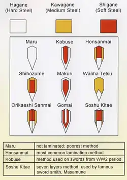 La lame du sabre japonais est traditionnellement forgée à partir d’un acier brut (tamahagane) transformé en acier composite : le massiot d’acier. Celui-ci est naturellement composé de deux nuances et il est brisé en petits morceaux qui sont triés en fonction de leur dureté. Les morceaux durs (hadagane ou kawagane) contiennent plus de carbone et sont utilisés pour l’enveloppe tandis que les morceaux plus tendres (shingane) sont utilisés pour le noyau.