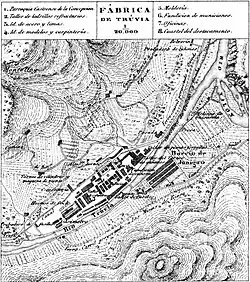 Doté de talent d’organisateur et d’une notoire capacité de travail, Elorza s’attela sans tarder à sa tâche, donnant ordre de démolir les vieux fourneaux et mettant en place une nouvelle structure manufacturière apte à produire des canons en fonte du meilleur niveau[14]. En application des récentes directives, les capacités de production de la manufacture s’accrurent progressivement, grâce à de nouveaux ateliers (tels que celui d’artillerie, joyau de l’architecture industrielle) et une puissance rehaussée, pendant que l’on construisait deux nouveaux hauts fourneaux (le Daoiz et le Velarde)[15]. Ainsi, cinq ans après l’arrivée d’Elorza à Trubia, un nouveau haut fourneau à coke, le Daoiz, entra-t-il en activité, qui permit de fondre, pour la première fois en Espagne et de façon pleinement satisfaisante, un canon d’artillerie de 68 livres ; l’autre fourneau fut lui aussi mis en marche cette même année 1849. Furent construits également, entre autres, un atelier de perçage et de meulage, un atelier de fabrication de projectiles, un atelier de fabrication d’armes à feu, un atelier de construction mécanique, deux ateliers de limage, ainsi que des ateliers de moulage, de serrurerie, de ferronnerie, de menuiserie et de carrosserie. On érigea aussi un four à chaux, et plus d’une douzaine de fourneaux de production de coke, en plus d’une aciérie pour la fabrication d’acier fondu, laquelle venait alors d’avoir commencé en Espagne. Dans les alentours de Trubia, des explorations et forages en profondeur furent effectués en quête de minerai de fer, puis les meilleurs sites sélectionnés pour exploitation, parmi lesquels se détachent en particulier les sites de Castañedo et de Berció, tous deux situés dans l’actuel concejo de Grado[14].