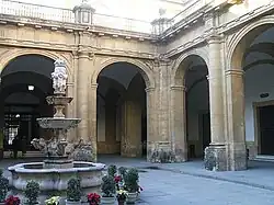 C'est à l’intérieur de l'édifice que se manifeste le mieux l'adéquation entre le bâtiment et ses fonctions originelles. Les quatre portails, placés au centre des différentes façades, s'ouvrent sur des couloirs, qui se rejoignent au niveau principal et structurent ainsi la fabrique selon un plan cruciforme. L'ensemble de l'édifice s'articule autour de trois vastes patios et de galeries qui donnent accès aux différentes salles. Le volume de ces couloirs et de ces cours surprend par sa monumentalité. Le patio principal se distingue par ses dimensions et sa belle facture néoclassique. Entouré de volumineuses galeries à arcs en plein-cintre, il est égayé en son centre par une ravissante fontaine baroque[11]. Deux petits patios, plus intimistes, sont également construits dans l'aile nord-ouest de l'édifice et disposent également de fontaines. De nombreux espaces ont été réhabilités afin de permettre leur utilisation dans le cadre universitaire : bureaux, salles de classe, amphithéâtres et bibliothèques ont remplacé les anciens ateliers.