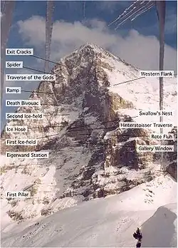 - Directissime (voie Harlin) : mars 1966 par John Harlin (qui y meurt), Dougal Haston et Layton Kor ; première hivernale de cette voie en 1970 par une grosse équipe japonaise avec de nombreuses cordes fixes ; première hivernale solitaire le 16 janvier 1990 par Slavko Sveticic en s'aidant beaucoup des cordes fixes[6].