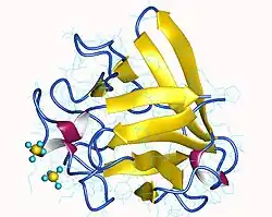 - ↑ (en) A. Elisabeth Eriksson, Lawrence S. Cousens et Brian W. Matthews, « Refinement of the structure of human basic fibroblast growth factor at 1.6 Å resolution and analysis of presumed heparin binding sites by selenate substitution », Protein Science, vol. 2, no 8, , p. 1274-1284 (PMID 7691311, PMCID 2142437, DOI 10.1002/pro.5560020810, lire en ligne)