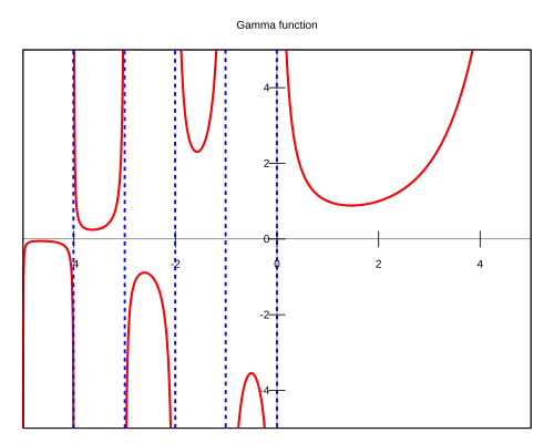 La fonction factorielle admet pour prolongement, à l'ensemble des nombres complexes autres que les entiers strictement négatifs, l'application où désigne la fonction gamma d'Euler. En effet, pour tout entier naturel n, on a :