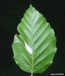 Les hêtres sont des arbres à feuilles caduques, toujours simples, ovales, alternes. Celles-ci montrent un limbe entier, (cilié à l'état jeune), denté, courtement pétiolé. La feuille du hêtre se distingue de celle de l'orme par sa symétrie. Sa nervation craspedodrome est pennée avec des nervures secondaires alternes[6].