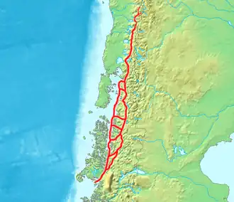 - ↑ (en) D. Lange, Cembrano, J., Rietbrock, A., Haberland, C., Dahm, T. et Bataille, K, « First seismic record for intra-arc strike-slip tectonics along the Liquiñe-Ofqui fault zone at the obliquely convergent plate margin of the southern Andes », Tectonophysics, vol. 455, nos 1–4, , p. 14 (DOI 10.1016/j.tecto.2008.04.014, Bibcode 2008Tectp.455...14L)