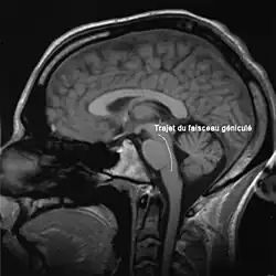 Le faisceau cortico-bulbaire relie le cortex moteur aux noyaux, origines des nerfs crâniens, dans le tronc cérébral. Dans son chemin, il traverse le genou de la capsule interne, ce qui lui vaut le qualificatif de « géniculé ».