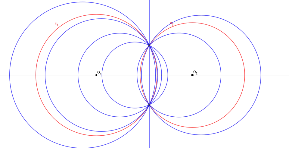 Si les deux cercles sont tangents en un point I, alors le faisceau de cercles est l'ensemble des cercles tangents à la droite perpendiculaire en I à la droite O1O2 et passant par I. Cette droite est l'axe radical.