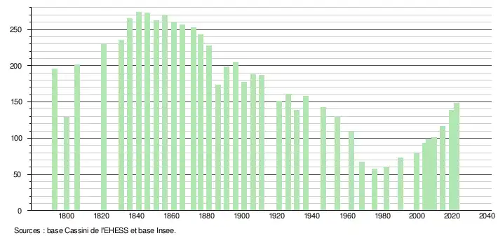 L'évolution du nombre d'habitants est connue à travers les recensements de la population effectués dans la commune depuis 1793. Pour les communes de moins de 10 000 habitants, une enquête de recensement portant sur toute la population est réalisée tous les cinq ans, les populations de référence des années intermédiaires étant quant à elles estimées par interpolation ou extrapolation[28]. Pour la commune, le premier recensement exhaustif entrant dans le cadre du nouveau dispositif a été réalisé en 2004[29].