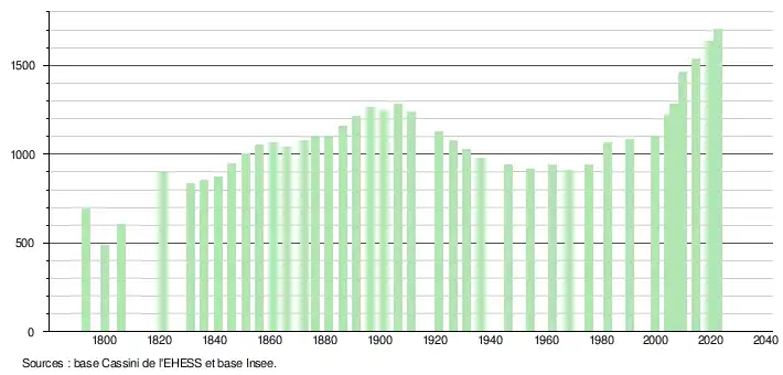 L'évolution du nombre d'habitants est connue à travers les recensements de la population effectués dans la commune depuis 1793. Pour les communes de moins de 10 000 habitants, une enquête de recensement portant sur toute la population est réalisée tous les cinq ans, les populations de référence des années intermédiaires étant quant à elles estimées par interpolation ou extrapolation[16]. Pour la commune, le premier recensement exhaustif entrant dans le cadre du nouveau dispositif a été réalisé en 2004[17].