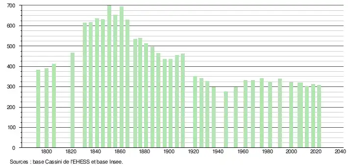 L'évolution du nombre d'habitants est connue à travers les recensements de la population effectués dans la commune depuis 1793. Pour les communes de moins de 10 000 habitants, une enquête de recensement portant sur toute la population est réalisée tous les cinq ans, les populations de référence des années intermédiaires étant quant à elles estimées par interpolation ou extrapolation[24]. Pour la commune, le premier recensement exhaustif entrant dans le cadre du nouveau dispositif a été réalisé en 2007[25].