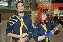 Le jeu présente plusieurs entreprise fictives[31]. On trouve ainsi Robco qui est une parodie de Ronco (en), de même que Nuka-Cola avec l'entreprise Coca-Cola[31]. Le nom de General Atomics est cité dans les œuvres de Robert A. Heinlein[31]. L'apparence de la Power Armor provient de films du même style que La Cité des enfants perdus (1995) de Jean-Pierre Jeunet[31]. Les armes énergétiques viennent de différentes œuvres, de Flash Gordon à Blade Runner (1982), en passant par les sérials[31]. La présence de créatures géantes comme les Radscorpions vient de divers films de science-fiction des années 1950 comme Them (1954)[31].