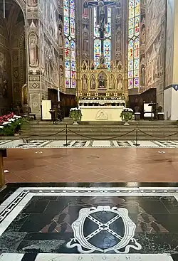 Santa Maria Novella (Florence): À droite de la façade se trouve le cimetière du couvent où sont enterrés les membres des familles les plus importantes de Florence. Le long du mur d'enceinte du cimetière se trouvent d'autres tombes, qui donnent également leur nom à la rue qui les longe (via degli Avelli). Les tombes sont décorées de deux armoiries familiales du défunt, séparées par la croix du peuple florentin[13]. On y trouve une tombe Alberti.Armoiries Alberti Basilica Santa Maria Novella Florence ItalieEntre 1458 et 1470, Leon Battista Alberti, par la munificence de Giovanni di Paolo Rucellai (dont le nom et la date de fin des travaux sont visibles en grosses lettres sous le tympan), créa le portail central et la partie supérieure de la façade, harmonisant les éléments préexistants avec ceux de la Renaissance. Pour ensuite harmoniser la nef principale avec les nefs latérales considérablement inférieures, il dessine les deux volutes inversées d'origine[14].
