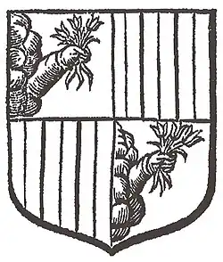| Blasonnement | Écartelé, aux 1 et 4 d'argent au bras de gueules sortant d'une nuée d'azur mouvant du flanc dextre, tenant une poignée de vesces en rameau de trois pièces de sinople ; aux 2 et 3 de sinople au pal d'argent, parti de gueules au pal d'argent. |