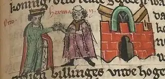 - Hermann Billung, mort le 27 mars 973, duc de Saxe, marié avec la comtesse Oda :