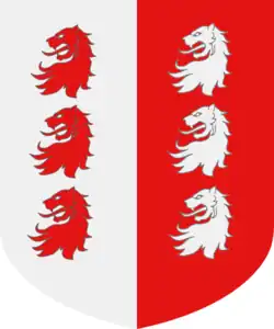 Armes : Parti d'argent et de gueules, les deux partitions chargées de trois têtes de Lions arrachées et posées en pal de l'un en l'autre.
