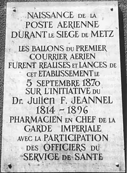 Plaque commémora- tive de la naissance de la poste aérienne pendant le siège de Metz en 1870 sur l'initiative de Julien-François Jeannel