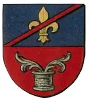 Les armoiries de cette famille[7] sont les suivantes : De gueules, au puits d’argent, d’où sortent deux palmes en bande et en barre du même, au chef cousu d’azur à la fleur de lys d’or, chargé d’un bâton péri en bande[8].