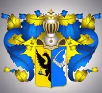 Les supports représentent une feuille azur, elle-même terminée par une feuille d'or. Au centre un écu divisé en deux parties : la partie senestre sur fond or représente un demi-aigle sable, il est coiffé d'une couronne or, emprisonné dans ses serres un orbe. Dans la partie dextre sur fond azur, sortant d'un nuage un bras protégé d'un canon d'arrière-bras, d'une cubitière et d'un canon d'avant-bras argent dont la main nue tient une épée argent. Cet écu est surmonté d'un heaume couronné, un lambrequin azur et or entoure l'écu.