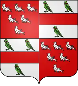 « D'argent à la fasce de gueules accompagnées de trois perroquets de sinople colletés du second émail. »