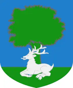• au 2e de même azur avec un arbre sur un terrain de sinople avec un cerf d'argent couché aux pieds de l'arbre.
