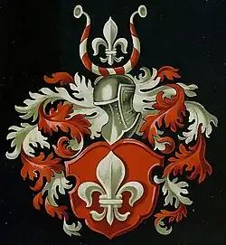 Les armes de la famille se blasonnent ainsi : De gueules à une fleur-de-lis d'argent accompagnée en pointe d'un mont de trois coupeaux de sinople.