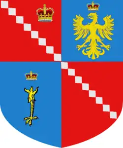 - Écartelé, aux 1 et 4, de gueules, à huit losanges d'argent, rangées en bande et aboutées, acc. au canton senestre du chef d'une couronne d'or, au 2, d'azur, à l'aigle éployée d'or, surmontée d'une couronne impériale, au 3, d'azur, à un membre d'aigle d'or, couronné du même. (ou de gueules au dragon ailé de sinople, ayant deux pattes, rampant, la queue dardant en bas). Cimier: un buste d'homme, habillé d'un manteau d'azur, au rabat d'argent, coiffé d'un bonnet albanais d'azur, retroussé de gueules.(Venise, comtes)