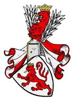 En argent un lion rouge couronné d'or. Sur le casque avec des lambrequins rouges et argentées comme cimier, une croupe de lion couronnée d'or rouge poussant entre deux plumes d'argent[9].