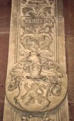 - Armoiries des seigneurs d'Oberstein, provenant de la tombe de l'abbesse Barbara von Heppenheim, nommée vom Saal († 1567), monastère de Rosenthal (Palatinat)