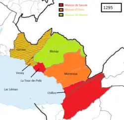 Girard Ier d'Oron, chantre de l'Église de Lausanne, achète la vidamie (ou vidomnat) de Montreux à l'évêque de Sion, Boniface de Challant, en 1295. Girard meurt en 1310. Son neveu Girard, fils de Pierre, hérite de la vidamie en 1312[13]. Les Oron ont inféodé la mestralie de Montreux et la mayorie de Clarens (deux offices dépendants de la vidamie) à leurs propres vassaux[55]. En 1317, le seigneur d'Oron cède la moitié est[note 4] de la vidamie à Pierre de Savoie. La partie ouest, qui devient la seigneurie du Châtelard[dhs 13] reste en possession de la famille d'Oron jusqu'en 1338, date à laquelle François de La Sarraz, qui avait épousé Marie d'Oron, en devient le seigneur[56]. Dès 1317, les Oron reconnaissent le comte de Savoie comme suzerain du Châtelard à la place de l'évêque de Sion.
