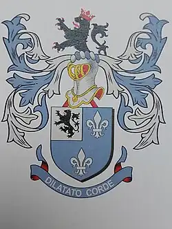 D'azur à deux fleurs de lis d'argent et au franc-quartier du même brochant, chargé d'un lion de sable armé et lampassé de gueules. Cimier: un lion issant de sable armé, lampassé et couronné de gueules.