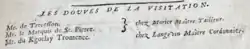 XXe siècle : de Lestapis, Blanchet de la Sablière, Monjaret de Kerjégu de Keranflec'h-Kernezne, de Panevinon de Marsat, Bazin, de Menou, Sourdeau de Beauregard, Desclos de la Fonchais, de Poulpiquet, Maillard, Géliot, de Lignières, Hingant de Saint-Maur, de Lantivy de Trédion, de Vitton de Peyruis, Houlier de Villedieu, Van der Cruisse de Waziers, Brincard, Macé de Gastines, Hentsch, Gilart de Keranflec'h, de la Guerrande, de Chavagnac, Lubomirski, de Silguy, Brillat-Savarin, de Viry, de Vial, Gourlez de la Motte, de la Berrutière de Saint-Laon, de Rougé, Géliot, de Lauzanne, de Fraguier, Potiron de Boisfleury, le Marchand de Guignard de Saint-Priest, de Nicolaÿ, de Lanversin, de Malliard, Hentsch, Guillaume, Poumeau de Lafforest, de La Cropte de Chantérac, de Pioger, de La Poëze d'Harambure, Le Tourneux de la Perraudière, Mérillou.