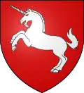 Armes : De geules, au lévrier saillant d'argent, colleté de gueules, au chef cousu d'azur, chargé de trois étoiles d'or. - Cimier : Un sauvage issant vêtu de gueules.[8]