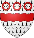 D'hermine à la fasce ondée de gueules accompagnée en chef de trois annelets rangés du même |