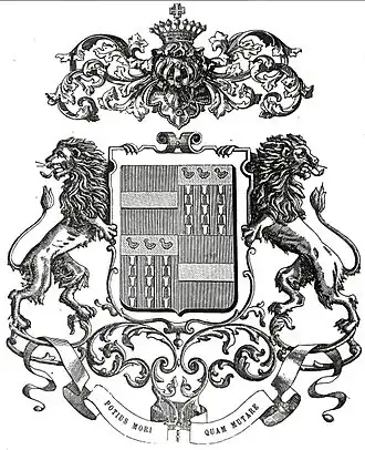 Supports : deux lions d'or, l'écu timbré d'un casque de chevalier sommé d'une couronne de comte ; cimier : une croix de Jérusalem[6].